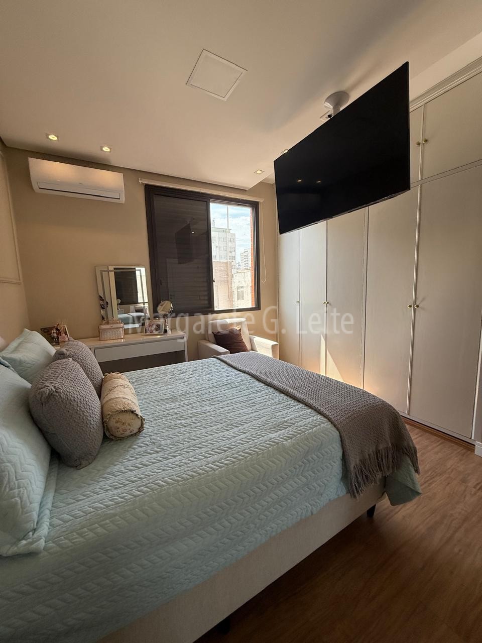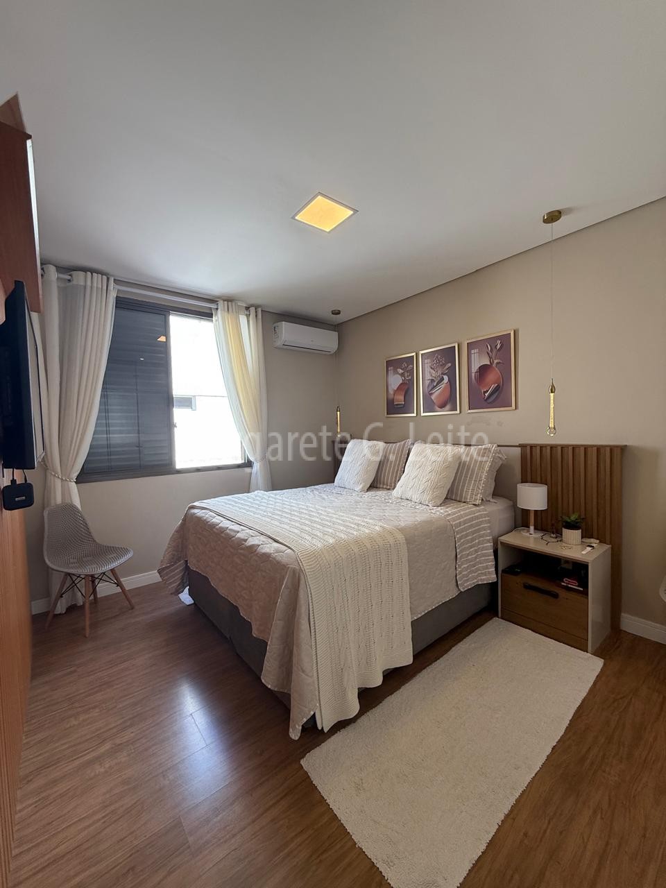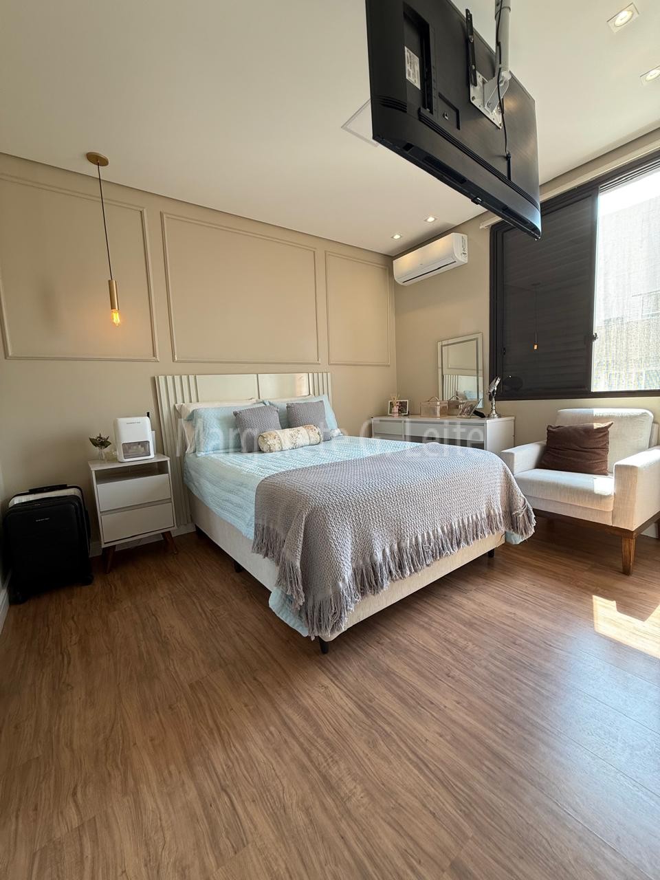 • Três dormitórios sendo uma suíte com armários  brancos piso laminado de madeira ar condicionado splith